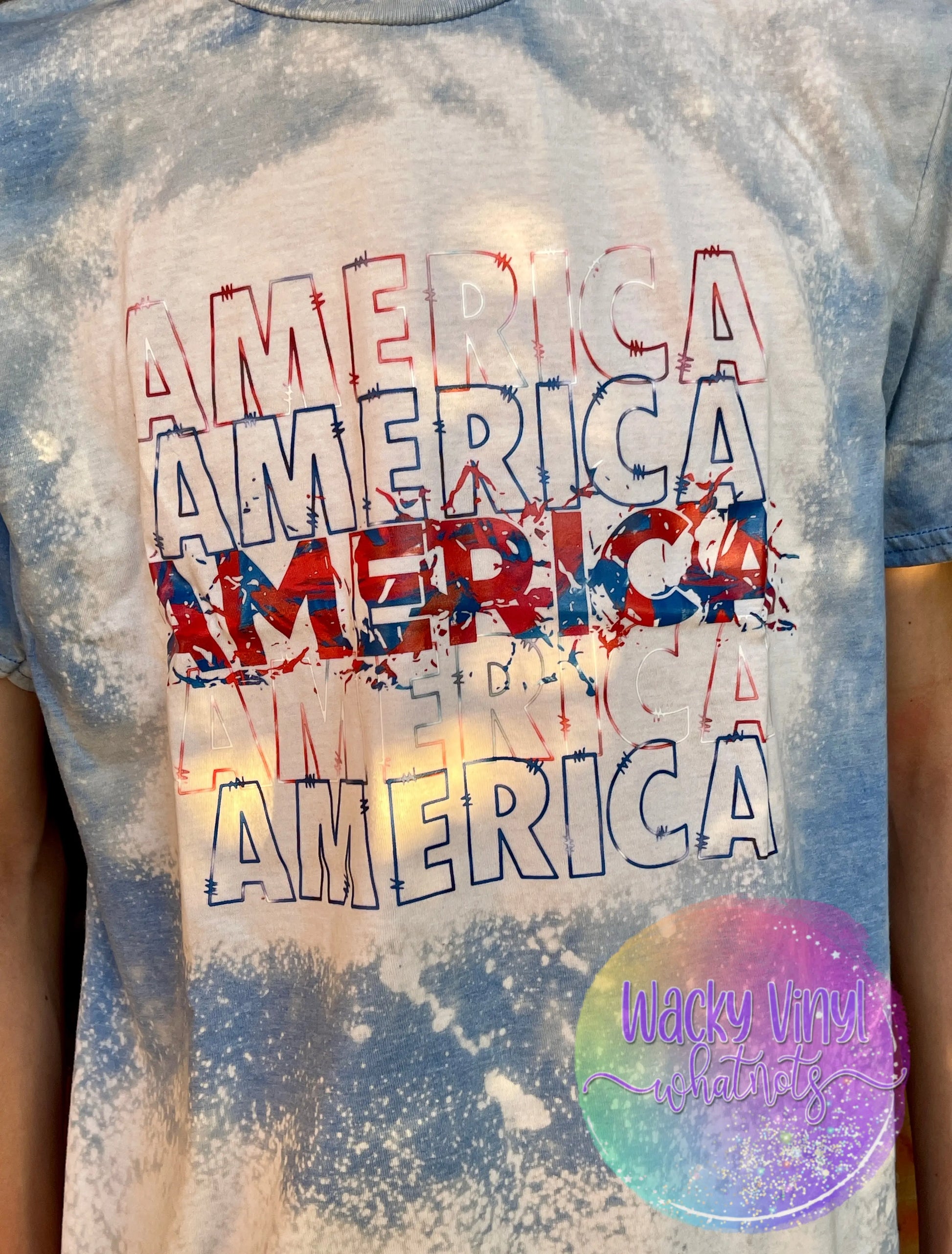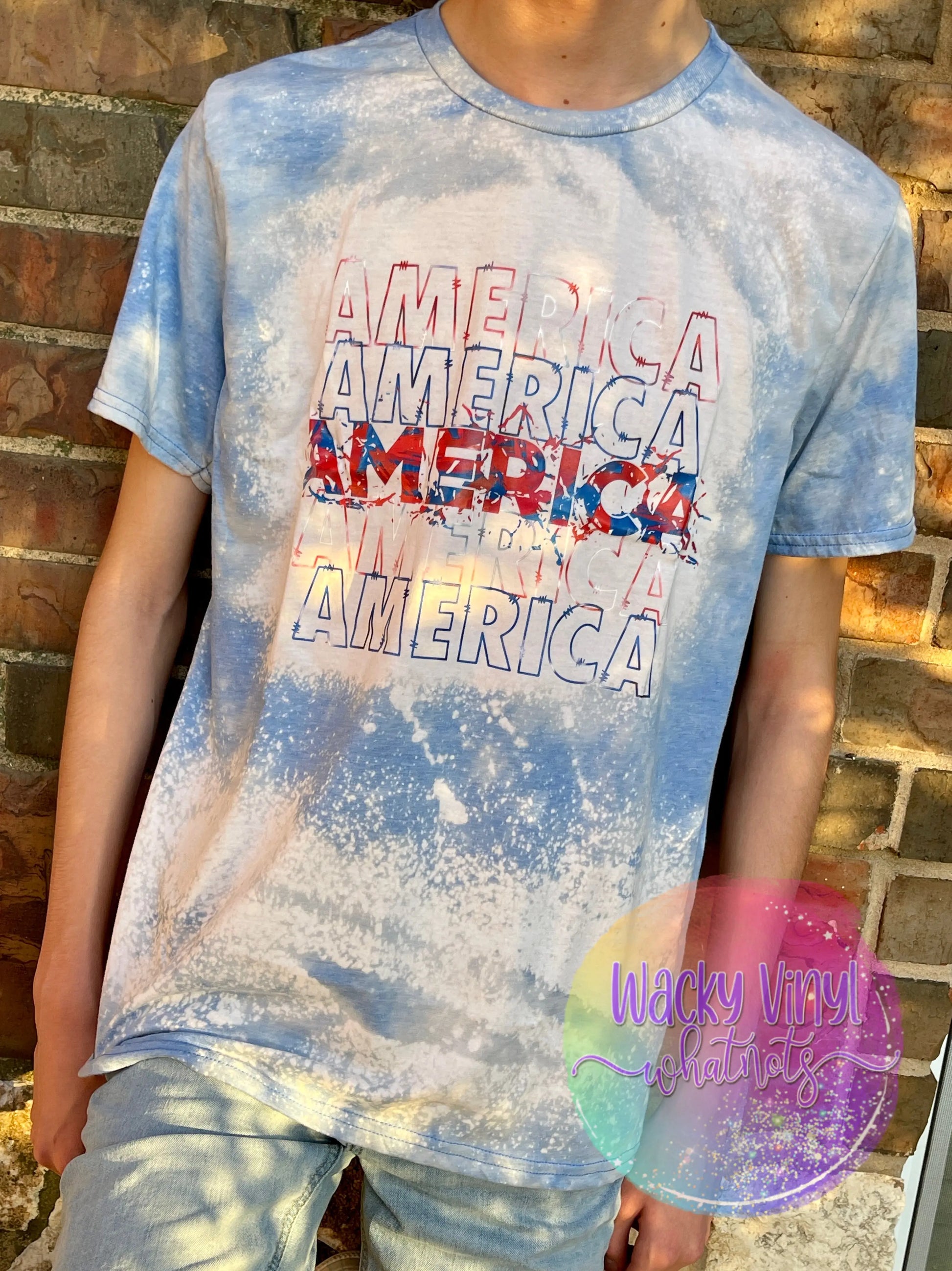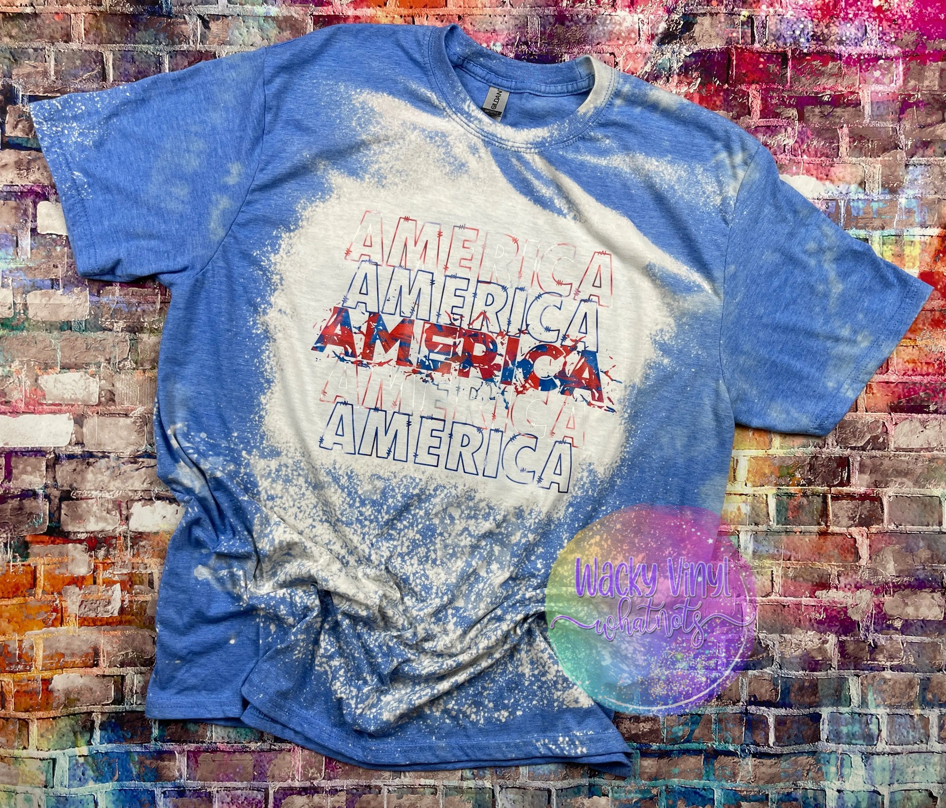 Image is a colored print pressed onto a bleached shirt, meaning that the print infuses into the fibers of the shirt and is made to last.